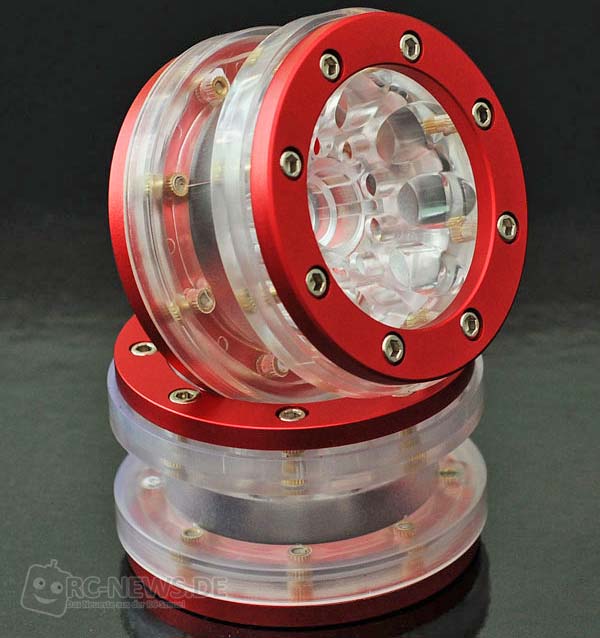 Für den vollen Durchblick sorgen die neuen Crawlerfelgen von RC4WD. Die Rock Ripper 2.2″ bestehen aus transparentem Kunststoff, so dass man einen freien Blick auf die Achsen hat. Über eingelassene Gewinde-Inserts werden die rot eloxierten Beadlock-Ringe mit je acht Schrauben sicher auf den Felgen gehalten.