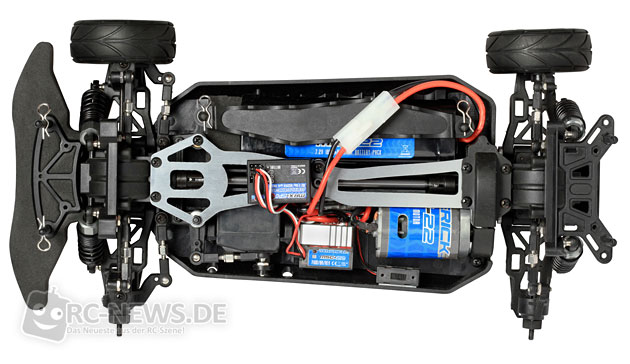Draufsicht auf das Chassis. Wie alle neuen Strada Evo-Fahrzeuge wird auch der Strada TC Evo komplett fahrfertig, also inklusive Akkus, Lader sowie einer Fernsteuerungsanlage ausgeliefert.