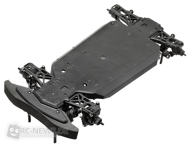 Die Chassisunterseite ist dank versenkter Schrauben völlig eben. An der Vorderachse kann man den großen Schaumgummi-Rammer erkennen.