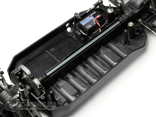 Ohne das Topdeck und die RC-Komponenten wird der Blick auf die Mittelwelle und das Kunststoff-Wannenchassis frei. Die Akkuhalterung eignet sich für Stick oder Side-by-Side Packs. Möchte man LiPo-Akkupacks fahren, wird man wohl den Dremel schwingen müssen.