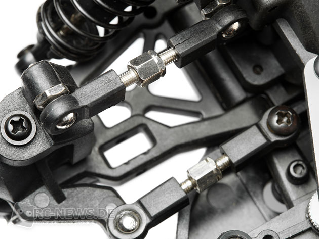 Die Vorderachse des Maverick Strada TC Evo. Das Fahrwerk ist voll einstellbar und mit stabilen C-Hubs und Lenkhebeln versehen.