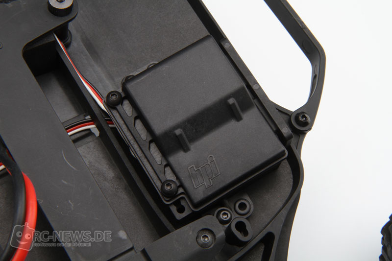 Hier sieht man die abgedichtete Empfängerbox, die hinten rechts im Chassis Platz nimmt
