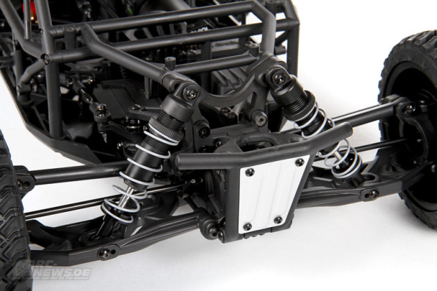 Die Spur- und Sturzstangen bestehen aus Kunststoff und sind nicht einstellbar. In der Baukasten-Version findet man an dieser Stelle einstellbare R/L-Gewindestangen.