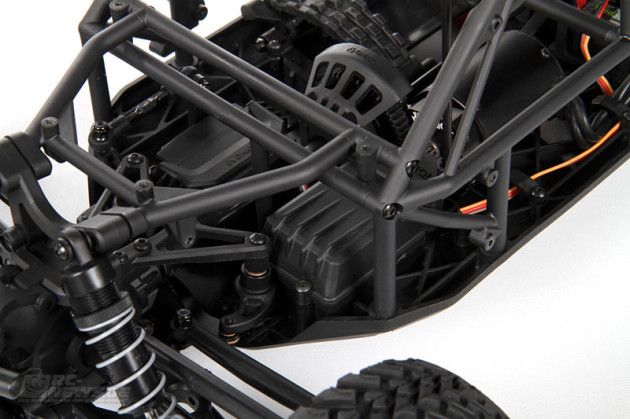 Der Empfänger sitzt in einer abgedichteten RC-Box, dahinter findet der Brushless-Motor seinen Platz. Durch den robusten Überrollkäfig sind alle Komponenten bei Crashs gut geschützt.