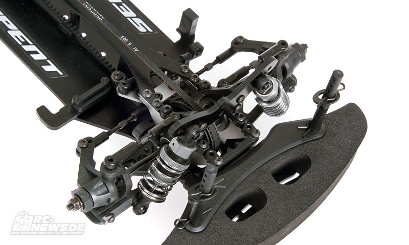 Der S411 im direkten Vergleich mit dem S411 in der Sport Version. Der augenfälligste Unterschied ist die Farbe des Chassis und der Dämpferbrücken, welche in der Sport-Version schwarz sind und über keine Kohlefaserstruktur verfügen. Schaut man genauer hin, erkennt man die einfacher gestalteten Aluteile, die Kunststoff-Dämpfergehäuse und die Kunststoff-Lenkung.