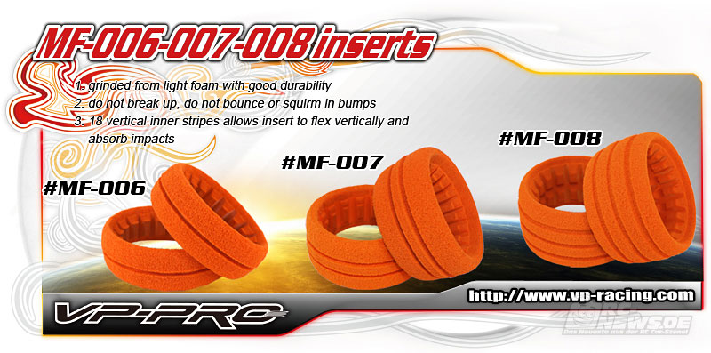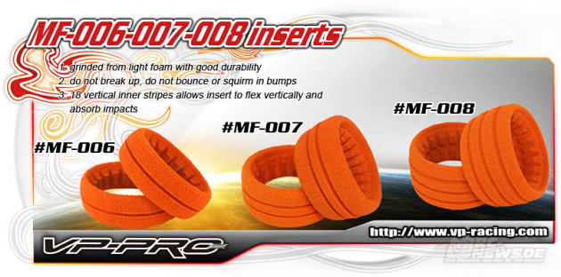 Von VP PRO wurden neue Reifeneinlagen für 2WD und 4WD Offroad-Buggies im Maßstab 1:10 vorgestellt. Die orangefarbenen Einlagen des taiwanesischen Herstellers sollen besonders leicht und haltbar sein. Zusätzlich sorgen 18 vertikale Rippen auf der Innenseite für ein verbessertes Dämpfungsverhalten.