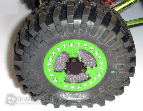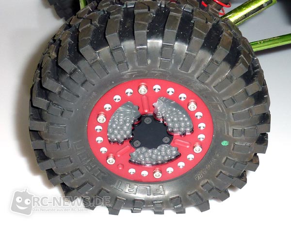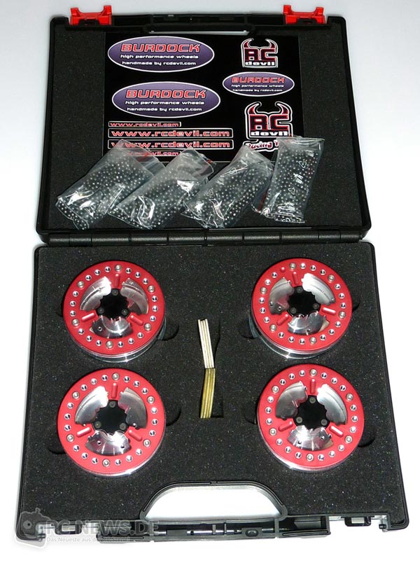 RC DEVIL präsentiert neue Felgen für 2.2″-Rockcrawler. Die Felgen können mit 3mm-Bleikugeln gefüllt werden, wobei diese sich immer in Richtung Schwerkraft bewegen und für maximalen Griff sorgen. Somit gibt es kein „Nachpendeln“ wie bei Pendelsystemen. Polycarbonat-Scheiben in den Felgen dienen als Sichtfenster und gewähren Einblick in das Tiefbett der Felge. Über ein kleinen Deckel aus Aluminium auf dem äußeren Felgenring kann die Felge mit Bleikugeln befüllt werden. Das komplettes Set wird in einem Kunststoffkoffer geliefert und beinhaltet 4 Felgen, 4 x 120g Bleikugeln, Felgenringe, Felgenring-Deckel, Felgenadapter, Distanzringe, transparente Polycarbonatscheiben, Schrauben sowie ein Stickerset. Der Preis für ein komplettes Set der handgefertigten Felgen in giftgrün oder weinrot liegt bei 197 Euro.