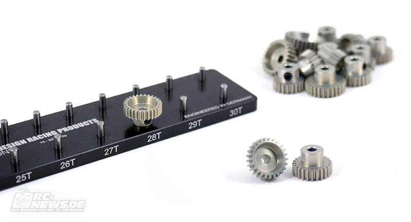 Von RDRP gibt es ein neues 48dp-Ritzelset, bestehend aus 16 Motorritzeln von 15 bis 30 Zähnen. Die leichtgewichtigen Ritzel bestehen aus CNC-gefrästem 7075er T6-Alu und sind hartbeschichtet. Eine passende Ritzelhalterung aus Alu liegt dem Set bei. Diese ist auch einzeln, ohne Ritzel erhältlich.