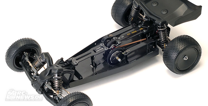Ähnlich wie beim 4WD-Buggy Cat K1 wird der Motor in der Chassismitte montiert, dahinter befinden sich die Halterungen für die LiPo-Saddlepacks. Optional können auch Shorty-Akkupacks im KF verwendet werden.